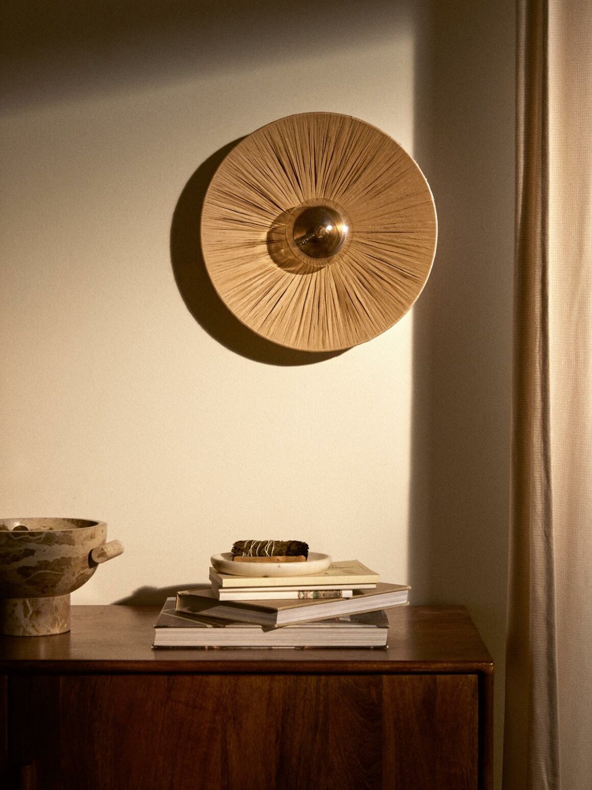 Buffet de rangement 899 € – Tapis en jute entrée couloir 77,99 € – Banc de rangement chaussures 209 € – Corbeilles de rangement entrée 249 €.