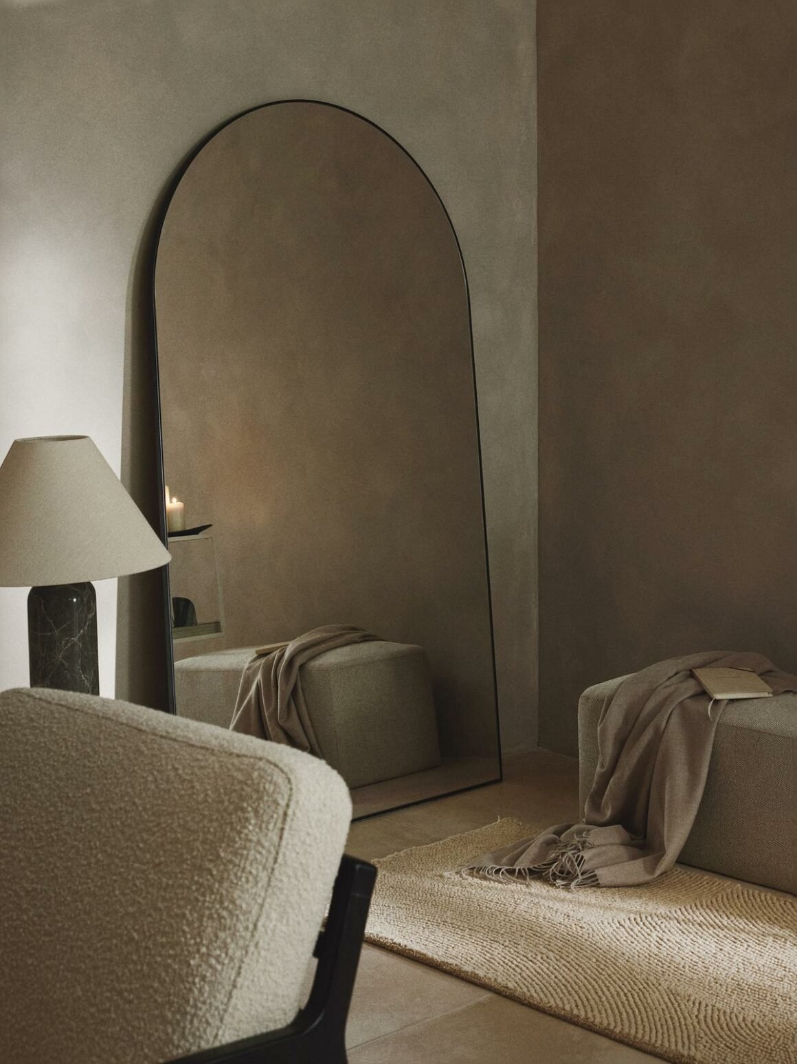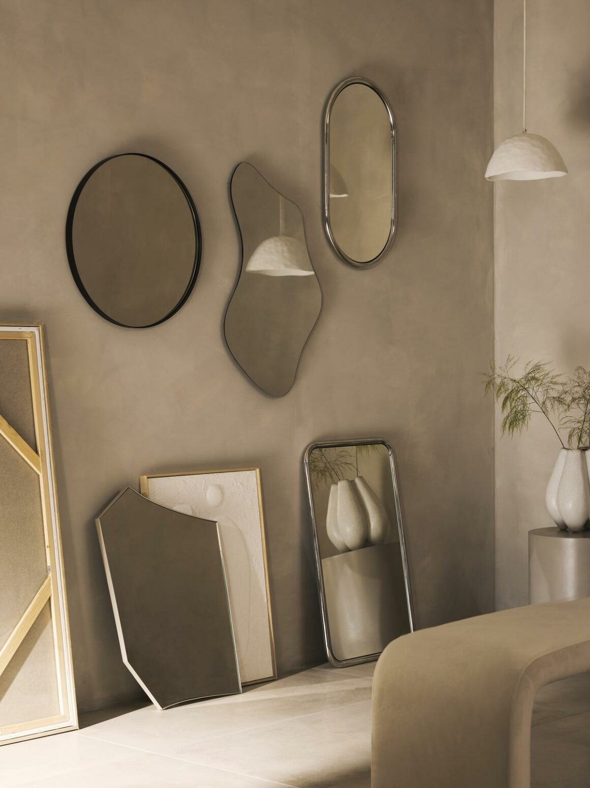 Grand miroir adossé au mur 549 € – Miroir forme organique 139 €.